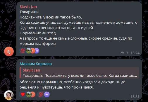 А когда вы становитесь нашим студентом, то получаете доступ ещё и к закрытому комьюнити, где вы имеете возможность обсудить и решение задач, и просто обратиться по любому вопросу (опять же — за поддержкой).