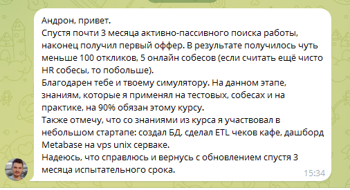 «Хочу пожелать всем студентам ничего не бояться, всё у вас получится. Если вы твёрдо решили, что это ваша профессия, то никто и ничего вас уже не остановит. Вступайте в наши дружные аналитические ряды, примем, расскажем, подскажем и будем все вместе зарабатывать 300к в секунду)»